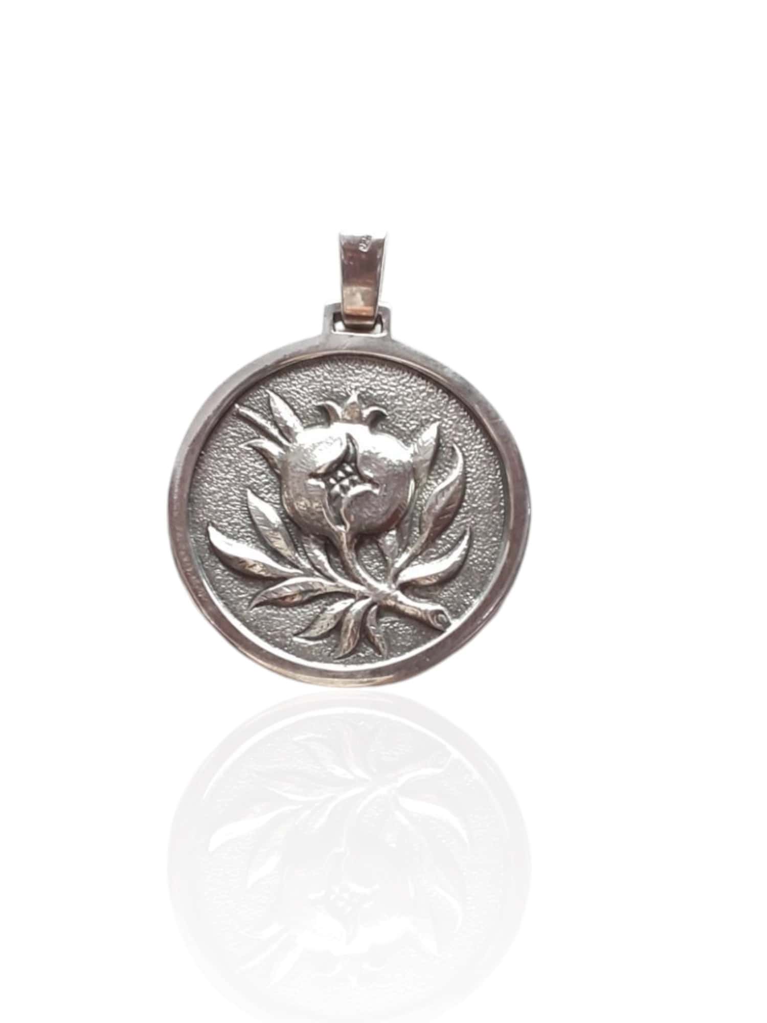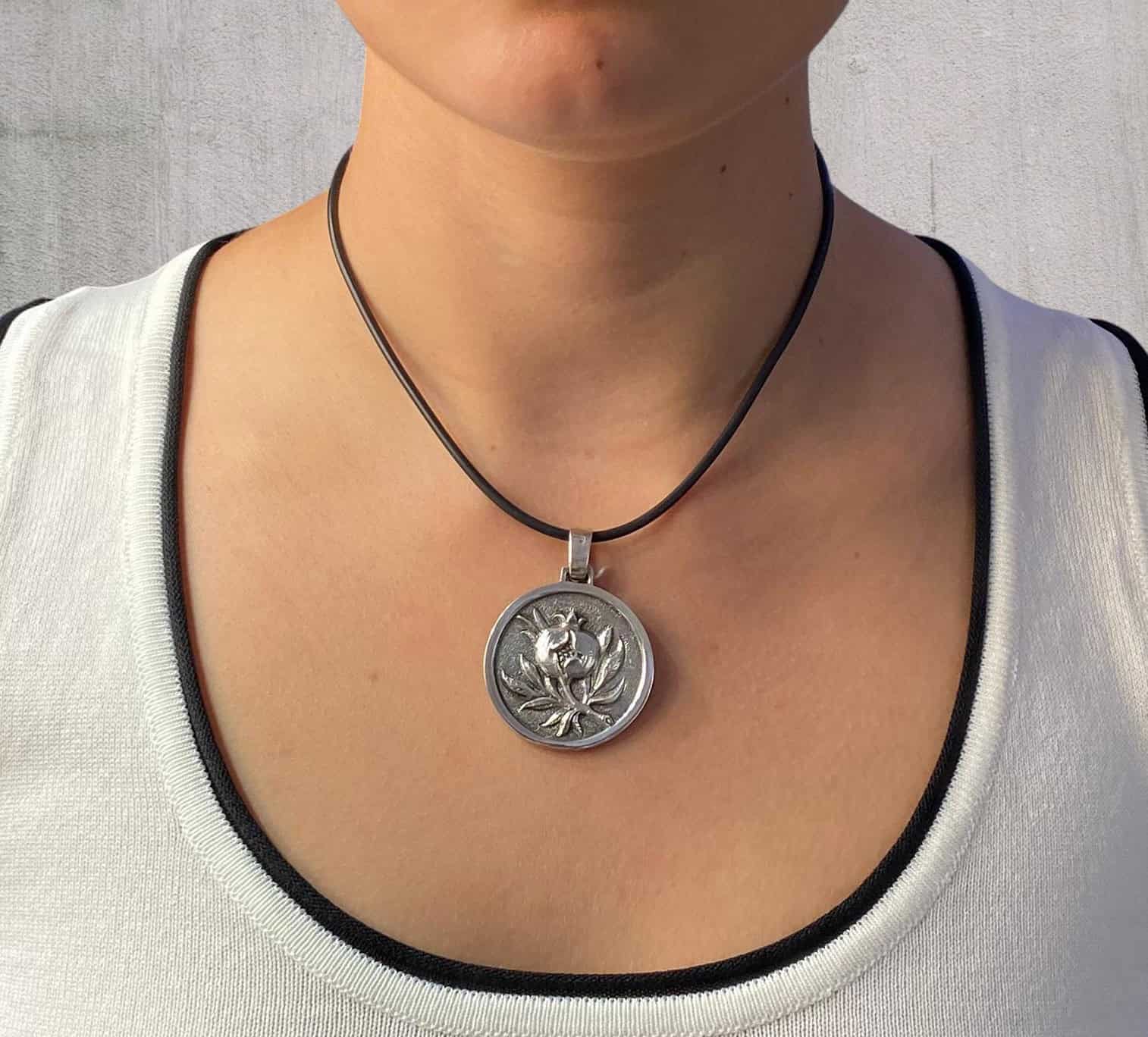 Colgante redondo de plata de ley con una granada que destaca por su elegancia atemporal y su carácter sofisticado. La plata, pulida con un brillo suave y luminoso, forma un marco circular armonioso que realza la pieza central.