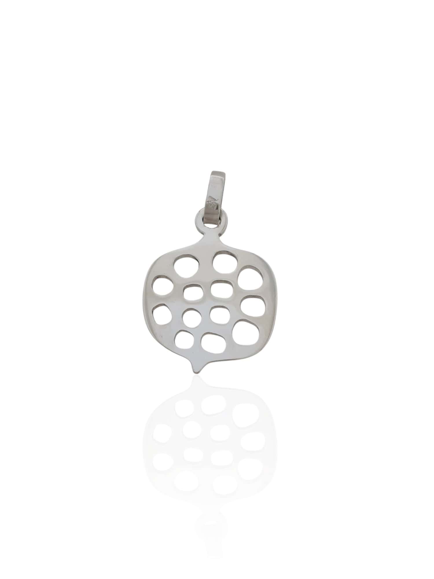 Colgante con forma de granada presenta un diseño artístico y evocador, cargado de simbolismo. La silueta exterior reproduce fielmente la fruta, con curvas suaves y una estructura bien definida. En su interior, el colgante está totalmente calado, compuesto por una red de agujeros delicadamente trabajados que atraviesan la pieza y crean un juego de luces y sombras al moverse.