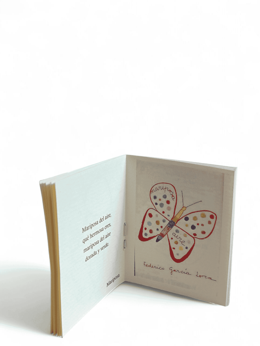 Exclusivo colgante artesanal en forma de mariposa, elaborado en plata de ley 925 con esmalte fino a fuego. Inspirado en la cultura y colorido de Lorca, esta joya única destaca por sus detalles vivos, con motas multicolores y la palabra “mariposa” grabada a mano, evocando libertad, arte y tradición mediterránea.