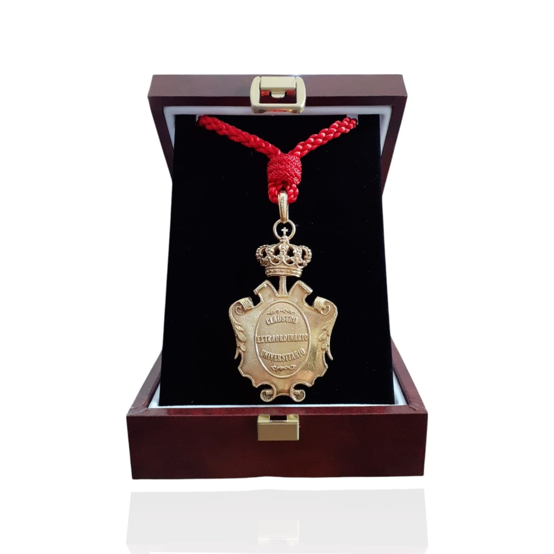 Distintivo académico de alta relevancia, elaborado en metal con acabado en baño de oro, símbolo de la más alta jerarquía universitaria. Esta medalla representa la excelencia académica, la autoridad docente y el reconocimiento a la trayectoria intelectual dentro del ámbito universitario.