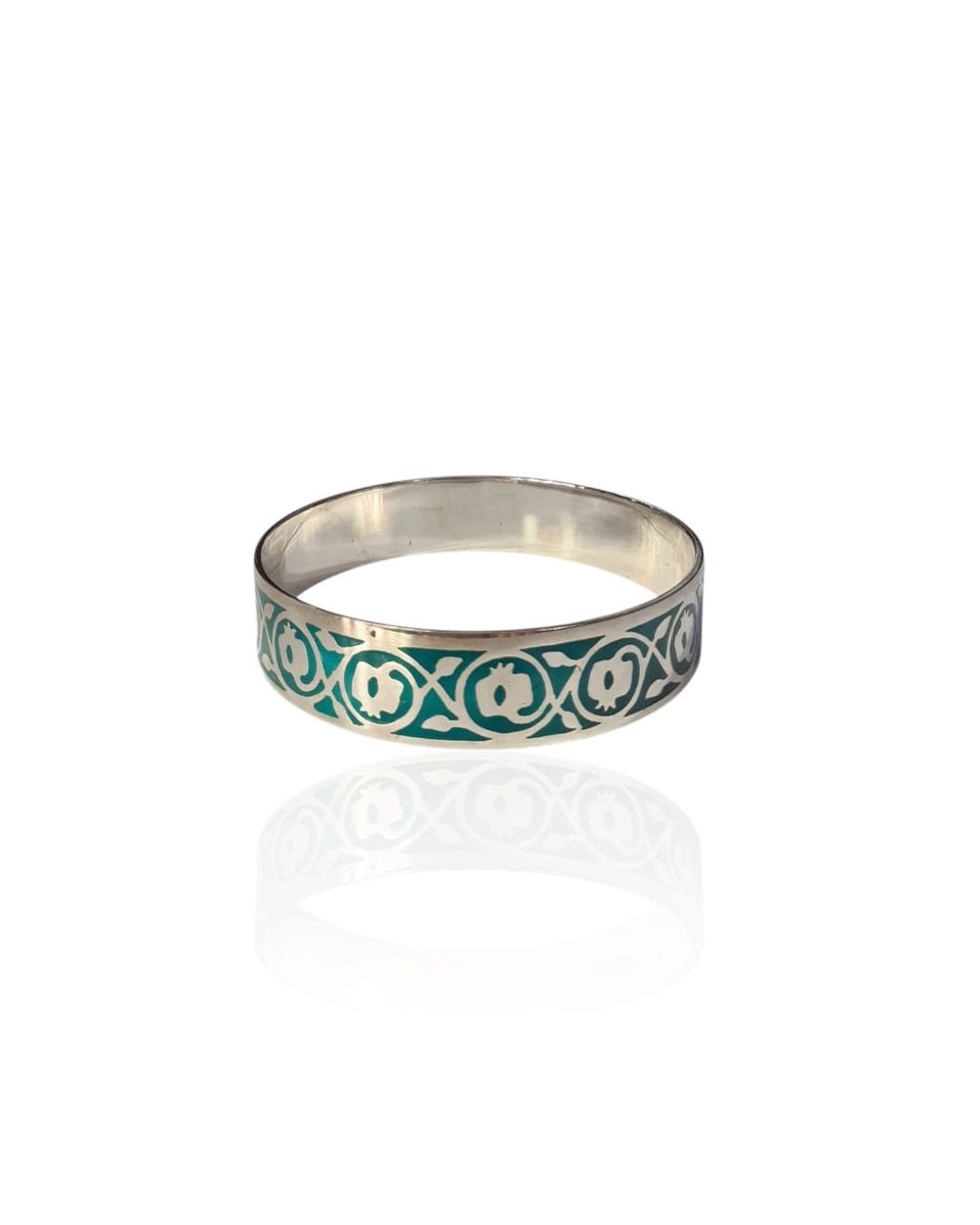 La estructura de plata, firme y pulida, ofrece un borde limpio que enmarca los motivos esmaltados y acentúa el carácter artístico de la pieza. Su forma rígida garantiza una presencia sólida y sofisticada en la muñeca, mientras que el diseño entrelazado de las granadas aporta un toque simbólico de fertilidad, abundancia y tradición.